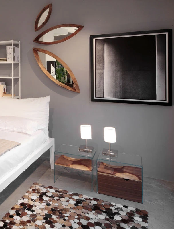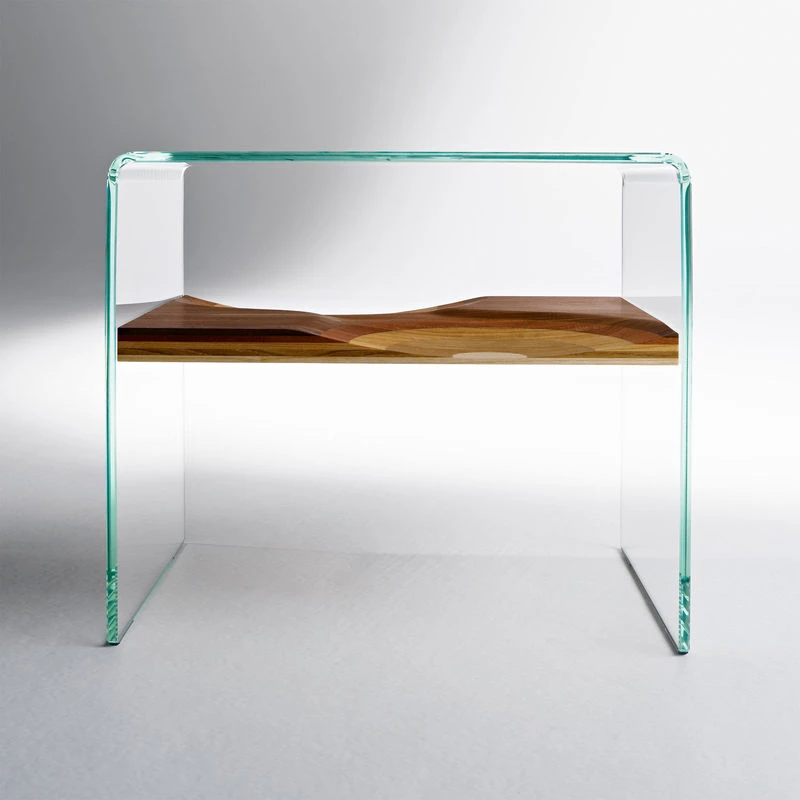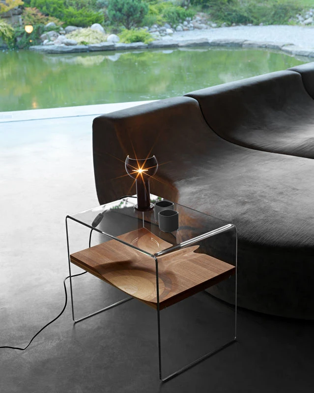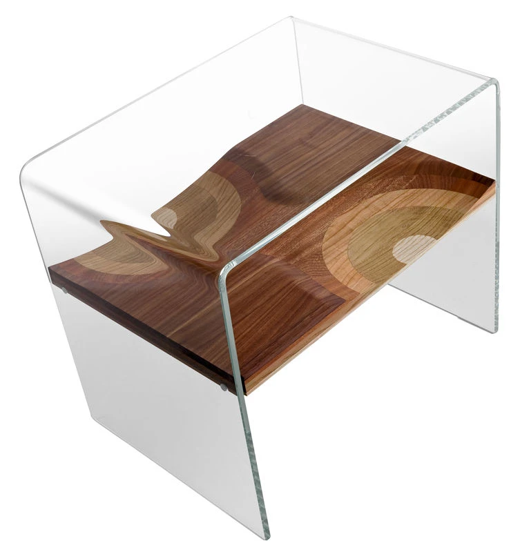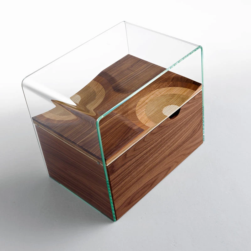 Frame in extra clear glass. Fixed shel « Ripples ». Drawer in walnut veneer with one white lacquered front. A slice of Ripple, the celebrity bench by Toyo Ito that won the Compasso d'Oro award in 2004, is used to make this new product from Horm. As a tribute to the concept of Toyo Ito, a dome in extraclear curved tempered glass surrounds Ripples and protects it. A chance for Ripples lovers to have a miniature Ripples where the Bench cannot fit. Bifronte is completed by a drawer on castors that has inspired the name (Bifronte means double face as the mythological Janus). A Drawer with two fronts, one in walnut veneer and the opposite in white lacquer that can play with different chromatic environments. THE PRICE INCLUDES ONLY THE BEDSIDE : THE DRAWER IS SOLD SEPARATELY.