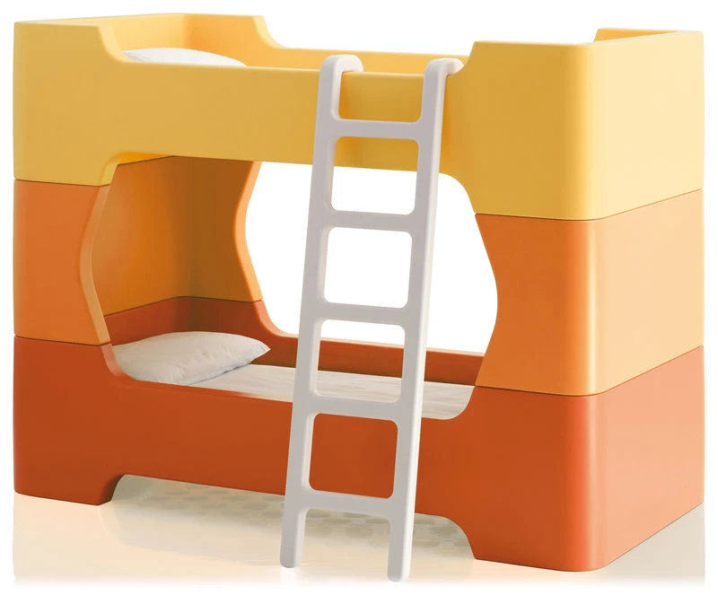Bunky is a completely modular concept – easily assembled from just four pieces. It is made from rotational-moulded polyethylene and creates a sturdy, secure sleep and play environment for kids. All surfaces are smooth with no sharp edges, and the material is highly durable and easy to clean. Perforations under the mattress allow for ventilation. Bunky is also available as a child's single bed.
