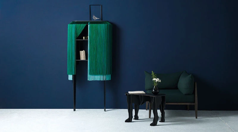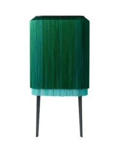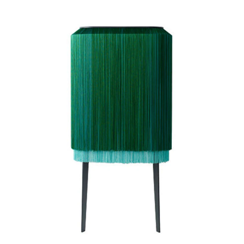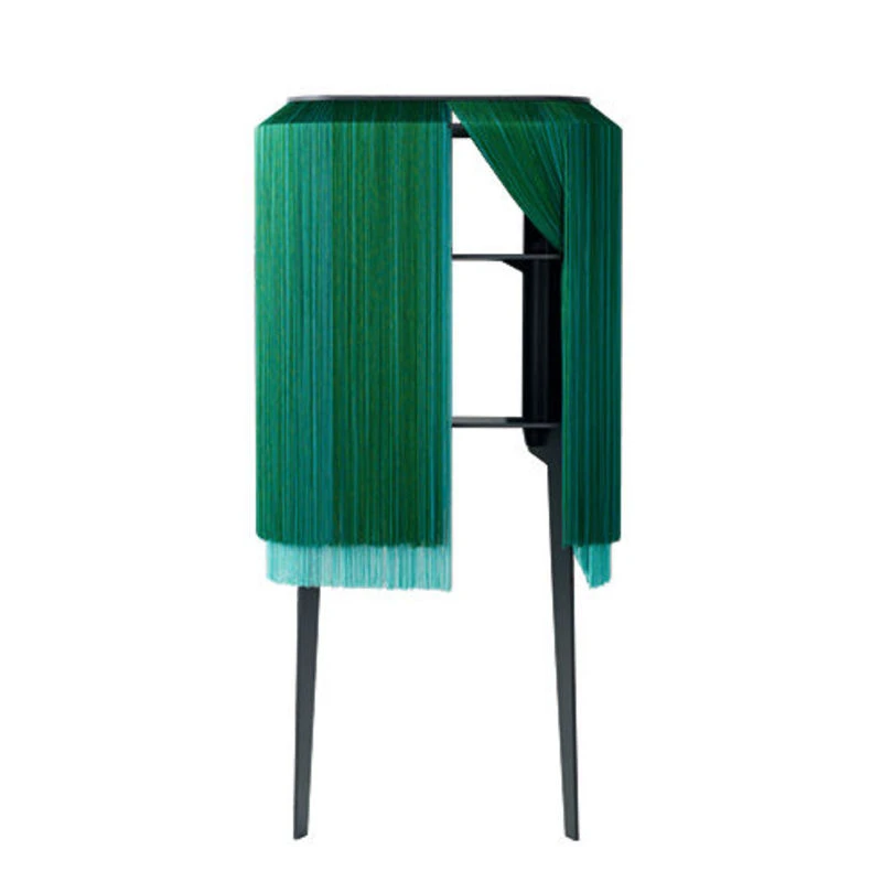 With the Alpaga family, Ibride is inventing fluid wall storage spaces in a softly concealed showcase. It is a new relationship being established with furniture, a tactile emotion. Adorned with long legs, the elegant Lady Alpaga hides so many small bottles, drinks, crockery and accessories behind her silky coat. Intimacy comes from the gaze, draped in caressing fringes. And the confident femininity of Lady Alpaga struts from the bedroom to the lounge with a vibrant colourful intensity. Retro, glamorous and a little crazy, lady Alpaga revisits the boudoir spirit and 30s style with great irony and modernity. Refined and bohemian, this furniture will find its place in either a classic or contemporary interior. Half animal, half plant, the presence of this furniture is troubling… With fringes on all sides, this mysterious Lady Alpaga furniture seems to be breathing under its long coat of silky fringes. Such a precious gem, the viscose fringes are available in wonderful harmonies of colour. They decorate the minimalist structure with an elegance and lightness. Its refined coat gives it the look of a miniature boudoir on legs, behind which secret items can hide, completely discreetly. The alter ego of privacy, it only reveals its mysteries to those who have tamed it. Lady Alpaga offers an original tactile experience: it is surprising to stroke it and run your hands through it, slipping them inside to discover what this waterfall of wools, that are silky and warm to the touch, hides. The Lady Alpaga high dresser has two legs: the back of the unit is wall mounted (wall fastening included). The stratified black HPL body is made up of two shelves. The shelves are completely open and accessible from all sides by spreading apart the fringes.