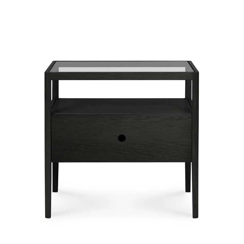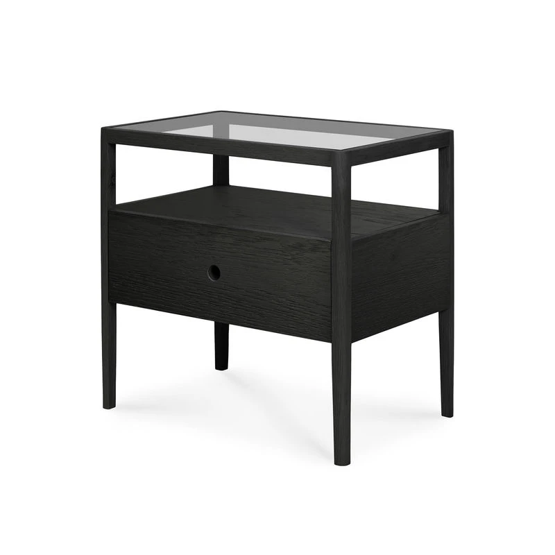 For twenty-five years, Belgian brand Ethnicraft has paid tribute to the beauty and authenticity of solid wood. Timeless, extremely strong and durable, these are quality pieces of furniture that age wonderfully and are passed down from generation to generation. Hand-crafted, Ethnicraft furniture is the result of exceptional know-how. Behind the apparent simplicity of the design hides a constant search for innovation. Integrating advanced techniques into the creative process, each new design is worked out down to the smallest detail. An authentic charm for this Spindle bedside table which mixes solid black oak with a transparent glass top. The rounded, slightly tapered shape of the legs is inspired by traditional bobbins used to wind wool. This functional bedside table has a drawer and open storage space. Perfect in the bedroom, it can also be used as a sofa end.