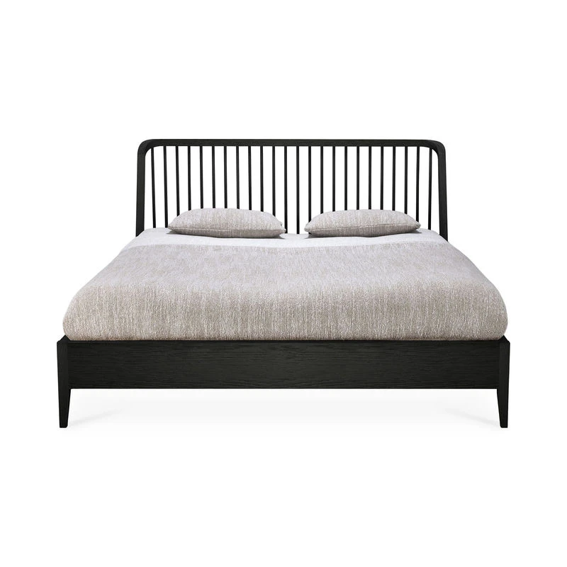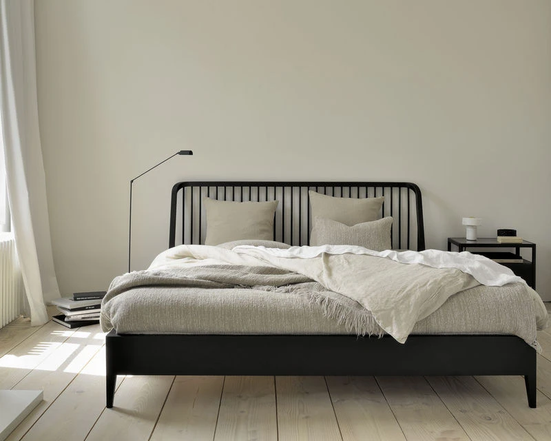 For twenty-five years, Belgian brand Ethnicraft has paid tribute to the beauty and authenticity of solid wood. Timeless, extremely strong and durable, these are quality pieces of furniture that age wonderfully and are passed down from generation to generation. Hand-crafted, Ethnicraft furniture is the result of exceptional know-how. Behind the apparent simplicity of the design hides a constant search for innovation. Integrating advanced techniques into the creative process, each new design is worked out down to the smallest detail. Entirely made of black-stained solid oak, Spindle is a double bed with a clean look and authentic charm. It’s inspired by traditional spinning wheels used to spin wool, integrating its spokes perfectly aligned into the headboard. You’ll love the graphic effect of this assembly of wooden spindles forming an openwork structure, rhythmic, balanced and airy. The simple lines of the Spindle bed demonstrate exceptional woodworking. PLEASE NOTE: This bed is suitable for a 180 x 200 cm mattress (mattress not included). Bed base is not included: it’s sold separately. This 180 x 200 cm Spindle double bed requires two 90 x 200 cm bed bases.