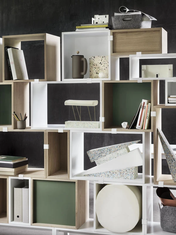 A small revolution, the Stacked 2.0 shelf system, an improved version with better quality finish, enables you to design your made-to-measure storage yourself! Thanks to the three sizes (S, M and L) of the modules and the different options (with or without back, with or without a door), you’re free to create new shapes. The different finishes (natural oak, grey, white and light grey) even enable you to invent multicoloured compositions. Combining the modules could not be simpler, simply use the clip provided with each module. No need for either screws or glue! Stacked, they can be used as an open and architectural partition to structure space in a fun way! Shelves, storage unit for the kitchen or the bathroom… anything is possible with Stacked! Stacked is a modular system: you can use only one module or assemble several to create shelving (or a partition) that can be transformed as many times as you like… You can stack the modules horizontally or vertically to create a beautiful, customised storage space! A multitude of combinations are available for you to use. A versatility limited only by your imagination! Each Stacked module comes with a metal assembly clip, which you can use to attach two modules together. You can also buy a set of 5 metal assembly clips separately (available in a range of colours) to assemble as many Stacked modules as you want. See set of 5 Stacked 2.0 assembly clips separately PLEASE NOTE. We do not recommend combining Stacked and Stacked 2.0 collections