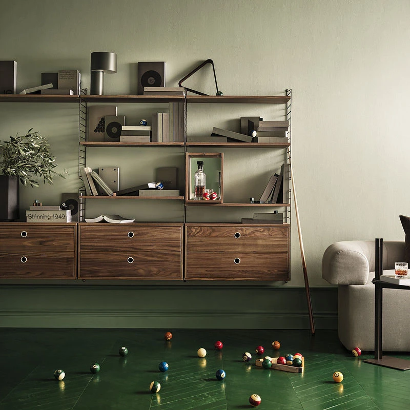 | Characteristics | Model dating back to 1949 (design icon) – Made in Sweden – Compartment with 1 drop-down door (opens at the bottom) – Compatible with all String® System plexi and grilled elements with a depth of 30 cm – The compartment fits into the String System side uprights (uprights sold separately) – This little compartment should be placed above a shelf or another String System compartment and attached to either of the uprights – Comes disassembled |