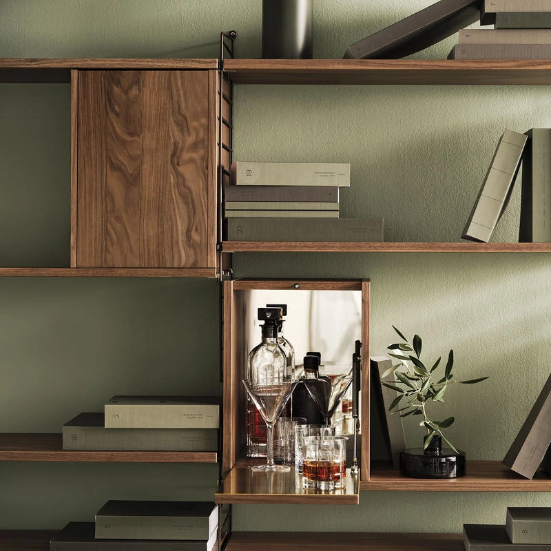 A Scandinavian design icon! The String shelving system was designed in 1949 by the famous Swedish designer Nils Strinning. The String shelf is still manufactured in Sweden according to high quality standards. Its design has not changed since 1949. Totally flexible, this shelving system gives you complete freedom to customise the look, dimensions and functions of your furniture. All elements (uprights, shelves, compartments) are sold separately and very easily assembled. The shelves and compartments fit easily into the side pillars without the use of tools. Shelves and compartments are adjustable in height. To make your String composition, just buy at least 2 side uprights. You can choose between floor- (which stand on the floor) or wall-mounted uprights. If you want to expand your shelving, you can add a third upright or more. This little compartment has a drop-down door (opens at the bottom). It measures: L 28 x D 30 cm x H 38 cm. This little compartment is compatible with all String® System plexi and grilled elements with a depth of 30 cm. It should be placed above a shelf or another String compartment, and attached to either of the uprights. The interior of the door is plated with brushed stainless steel. The bottom of the compartment is covered with a mirror plating. The compartment comes disassembled.