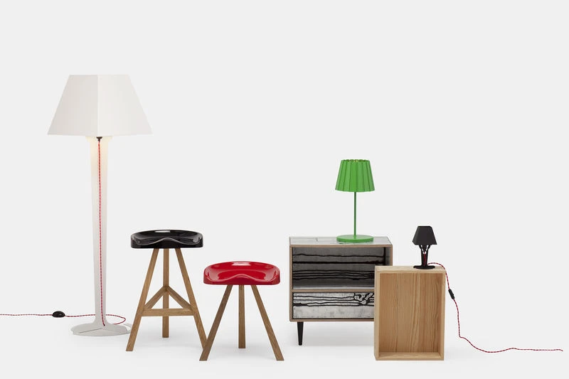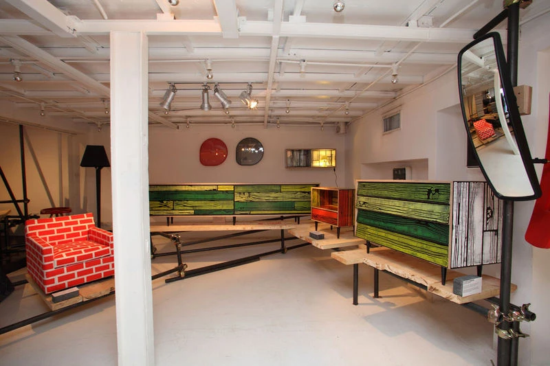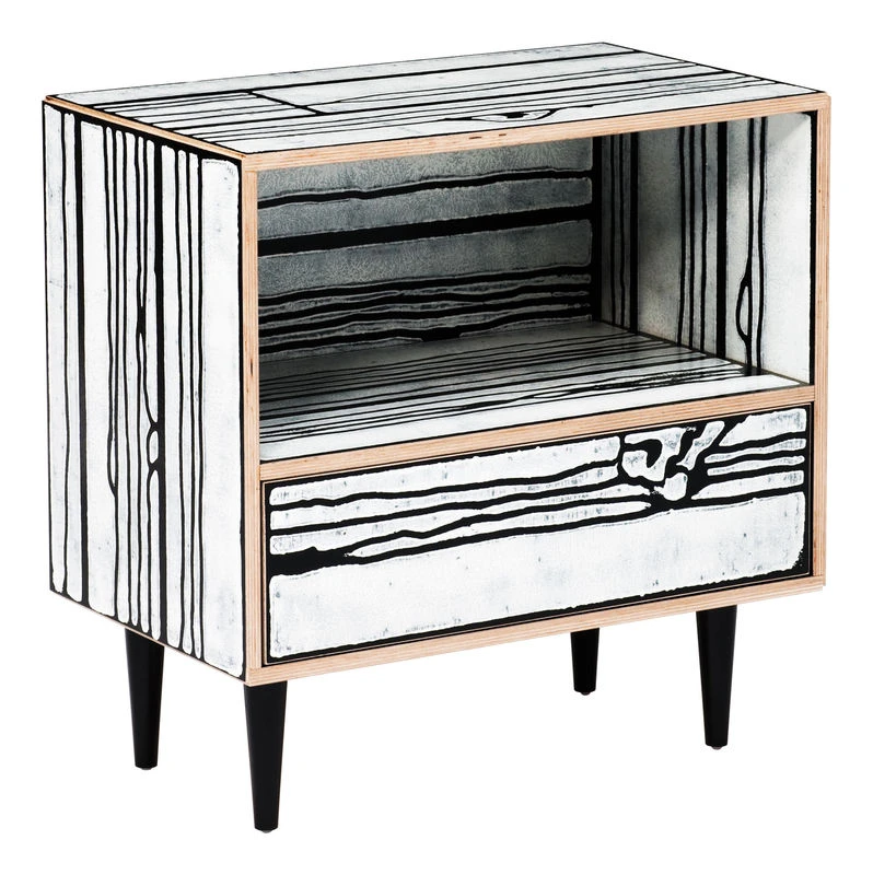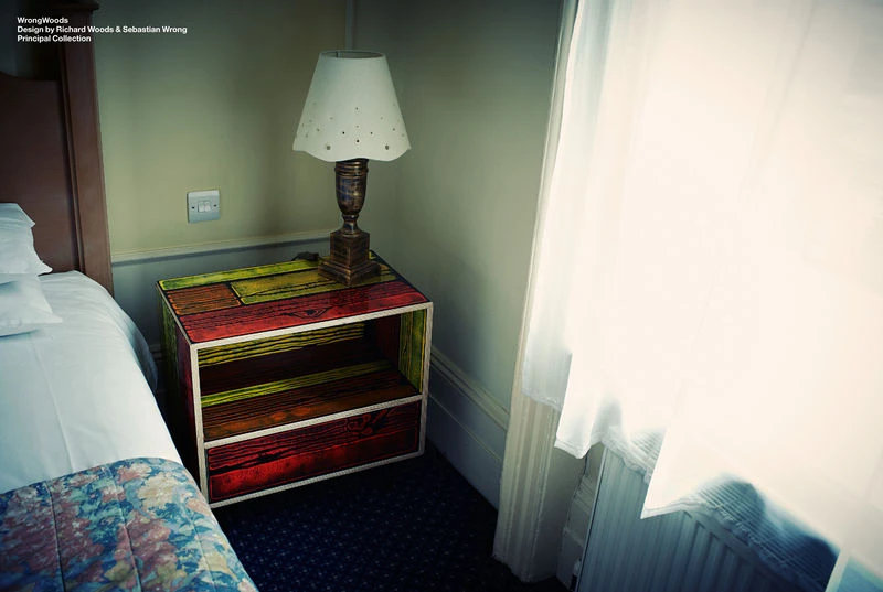 British artist Richard Woods is renowned for his work with garish and repetitious motifs. He has applied these to façades, floors and walls across the world in commissioned work and gallery installations. These ‘logos’ are often abstractions and interpretations of domestic pattern – the woodblock print being a particularly recognisable signature print. Designer Sebastian Wrong teamed up with Woods in the first design for Established & Sons’ programme of ‘Collaborations’ where individuals from two creative fields work together. Woods’ block printed motifs were applied to Wrong’s utilitarian cabinets. These are reminiscent of 1950s furniture – a fitting vehicle because much of Woods’ work is based on a nostalgia for mid-century domestic interiors. The result is a family of storage cabinets: a small night table with a spring-touch drawer, a chest of drawers and a long low credenza. The WrongWoods series is currently available in four of Woods’ signature colourways.”This aesthetic, combined with Richard Woods vibrant, graphic wood block print, puts the idea of ‘DIY’ back into design and adds decoration with a twist.” Sebastian Wrong. “The utilitarian feel of the furniture that we have made is somewhat at odds with the cartoon graphic surface that covers it, and I feel this marriage illustrates perfectly the success of the collaborative process. This is a new body of work that is both playful as well as being respectful to its aesthetic origins.” Richard Woods.